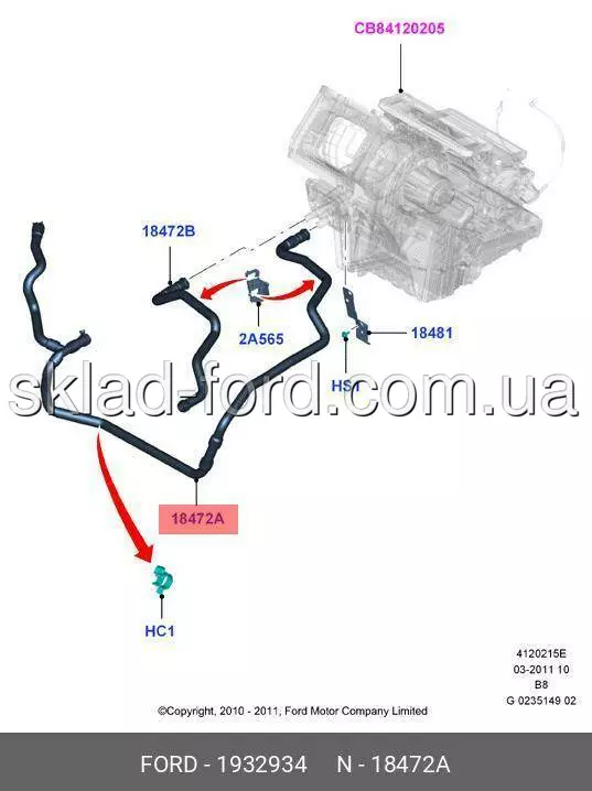 LH нижний патрубок печки подающий с тройником на бачек и термостат FOCUS 2012-- 2.0 TIVCT , 1932934