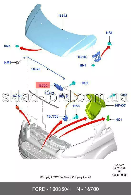 Замок капота без противоугонной сигнализации FOCUS,KUGA,ESCAPE,CUSTOM 2011---, CH 1808504