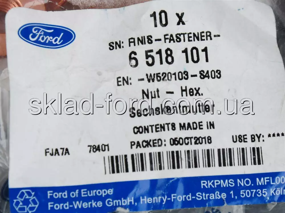 Жаростойкая гайка M10x1.5 выхлопной системы FIESTA,FOCUS,MONDEO,TRANSIT, 6518101